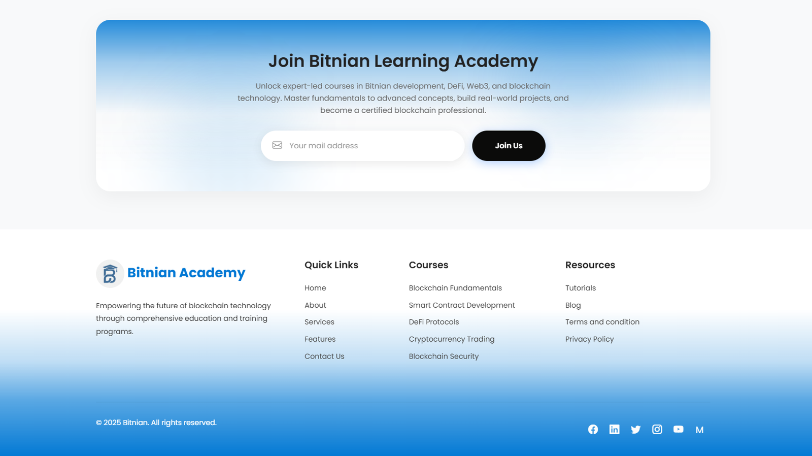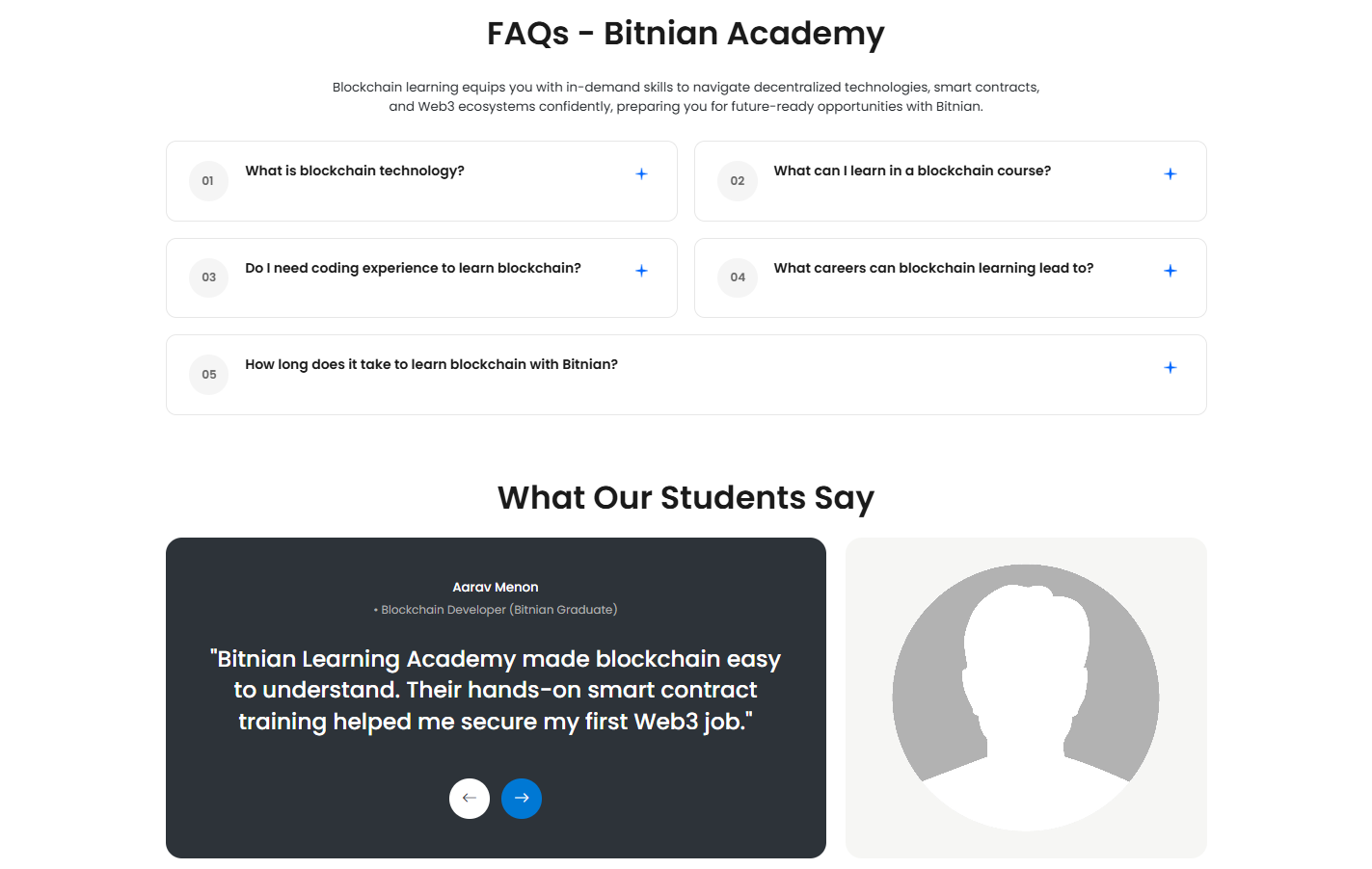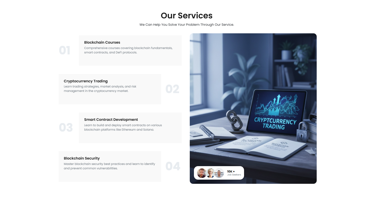 Build real-world projects with smart contracts, NFTs, and Web3 tools. Upgrade your skills and become a certified blockchain professional. Stay ahead with real-world bitnian projects, career support, and lifetime access to learning materials.