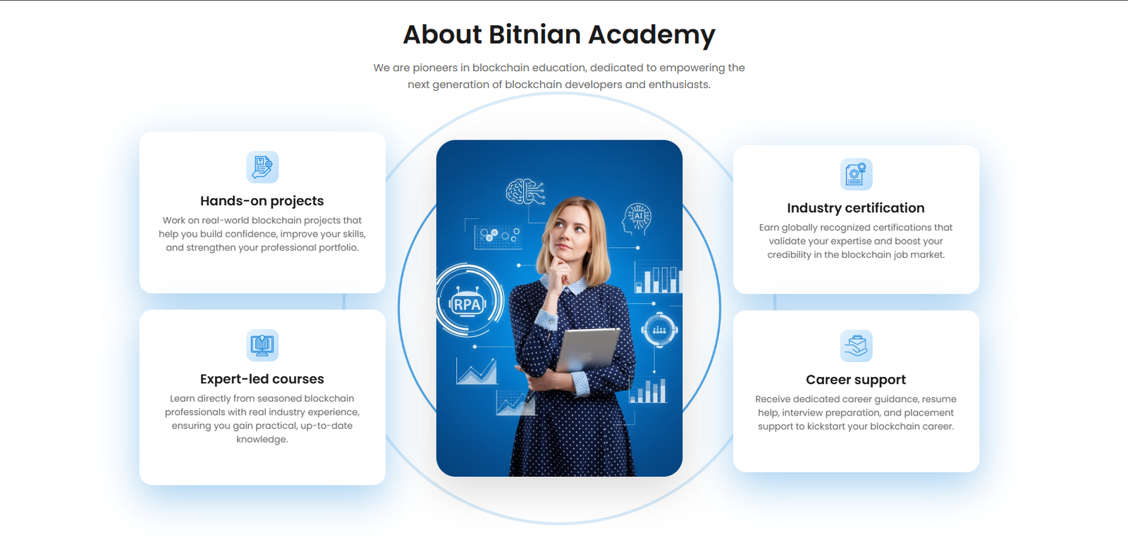 Build real-world projects with smart contracts, NFTs, and Web3 tools. Upgrade your skills and become a certified blockchain professional. Stay ahead with real-world bitnian projects, career support, and lifetime access to learning materials.